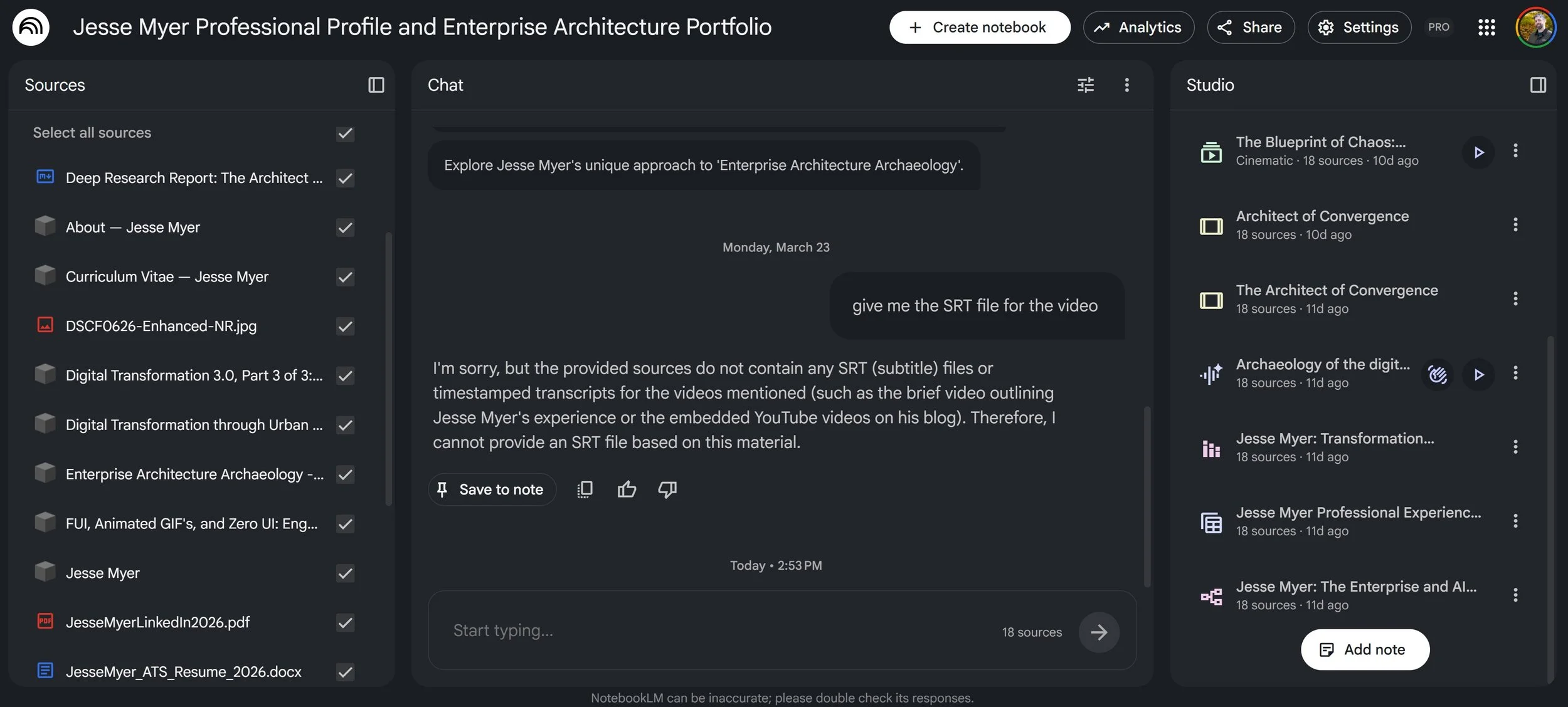 I built a NotebookLM workspace loaded with 18 sources: my Deep Research Report, CV, LinkedIn PDF, ATS resume, all my published Perspective articles, my About page, and supporting documents. The Studio panel generated named audio overviews from that material: "The Blueprint of Chaos," "Architect of Convergence," "Archaeology of the Digital..."; structured, listenable intelligence synthesized from my own source corpus, covering my career arc, architecture philosophy, and professional positioning from multiple angles.