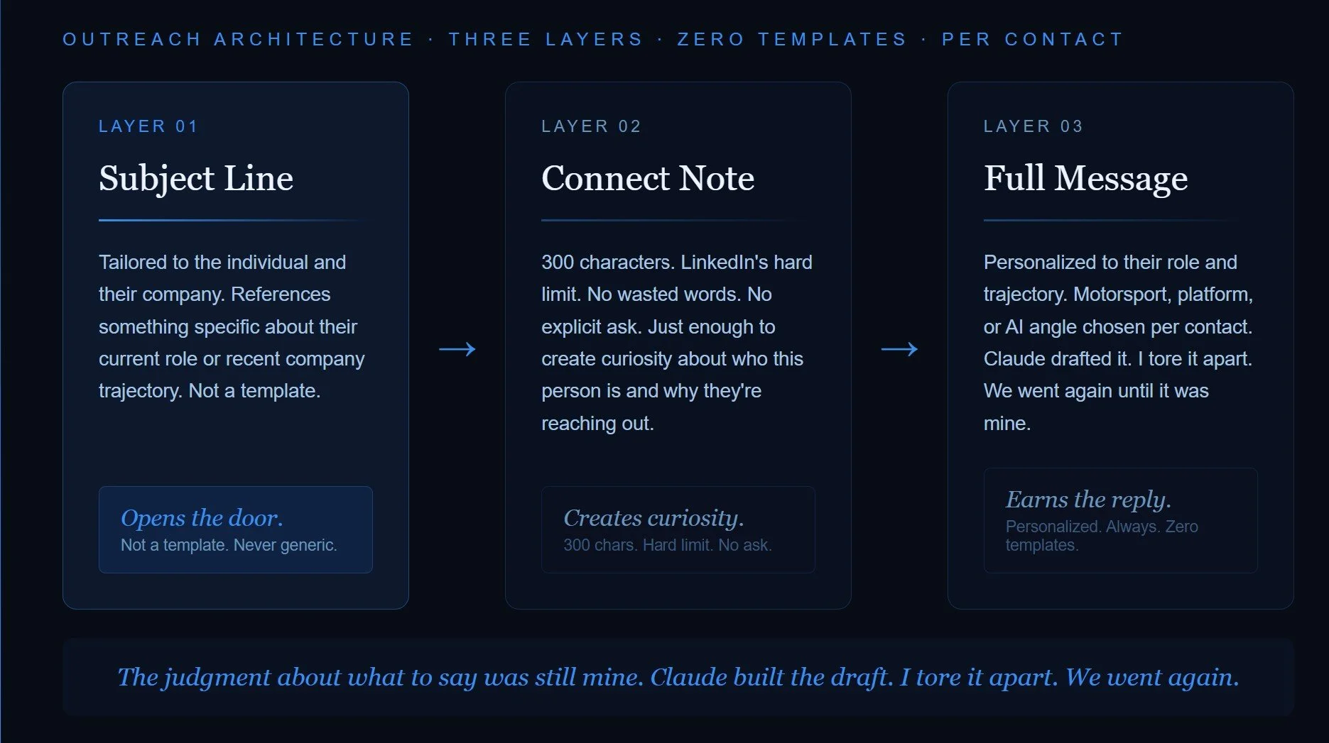 Where it pushed back is equally worth noting. When Claude suggested a forward outreach ask that was too aggressive for a first cold touch at the CEO level, I redirected immediately: the message became three sentences, no explicit ask, just enough to create curiosity. That rewrite was the right call. It connected.