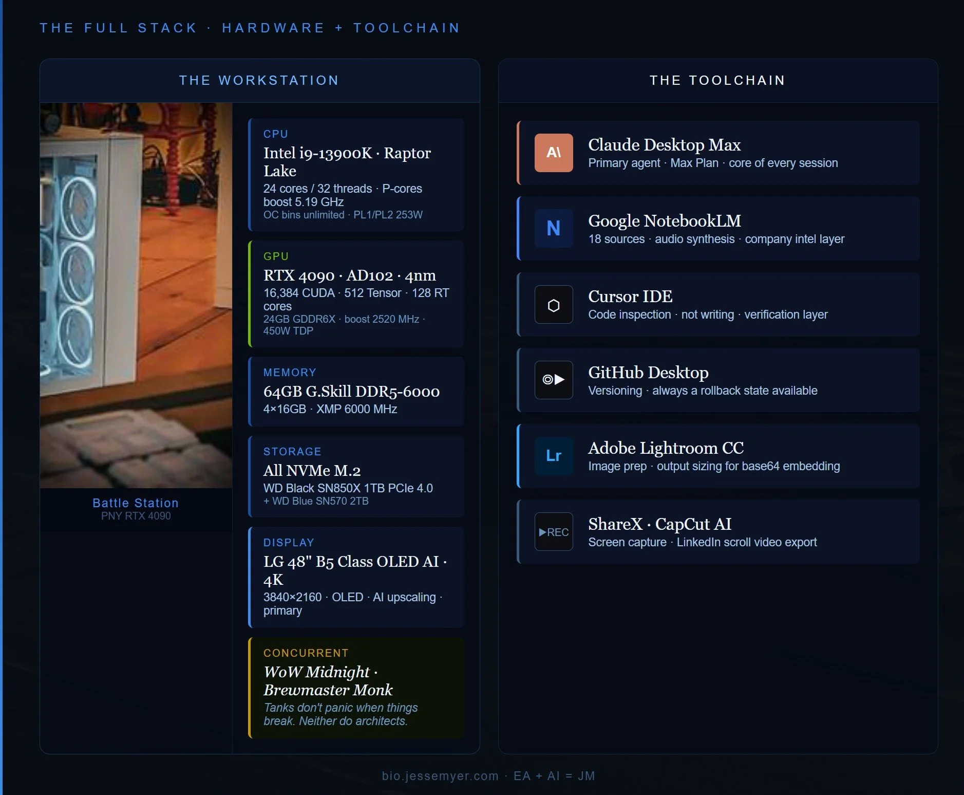 Claude wrote every line. Cursor inspected it. GitHub Desktop versioned it. Lightroom CC sized every image for optimal base64 weight before it went in. I wrote every requirement.