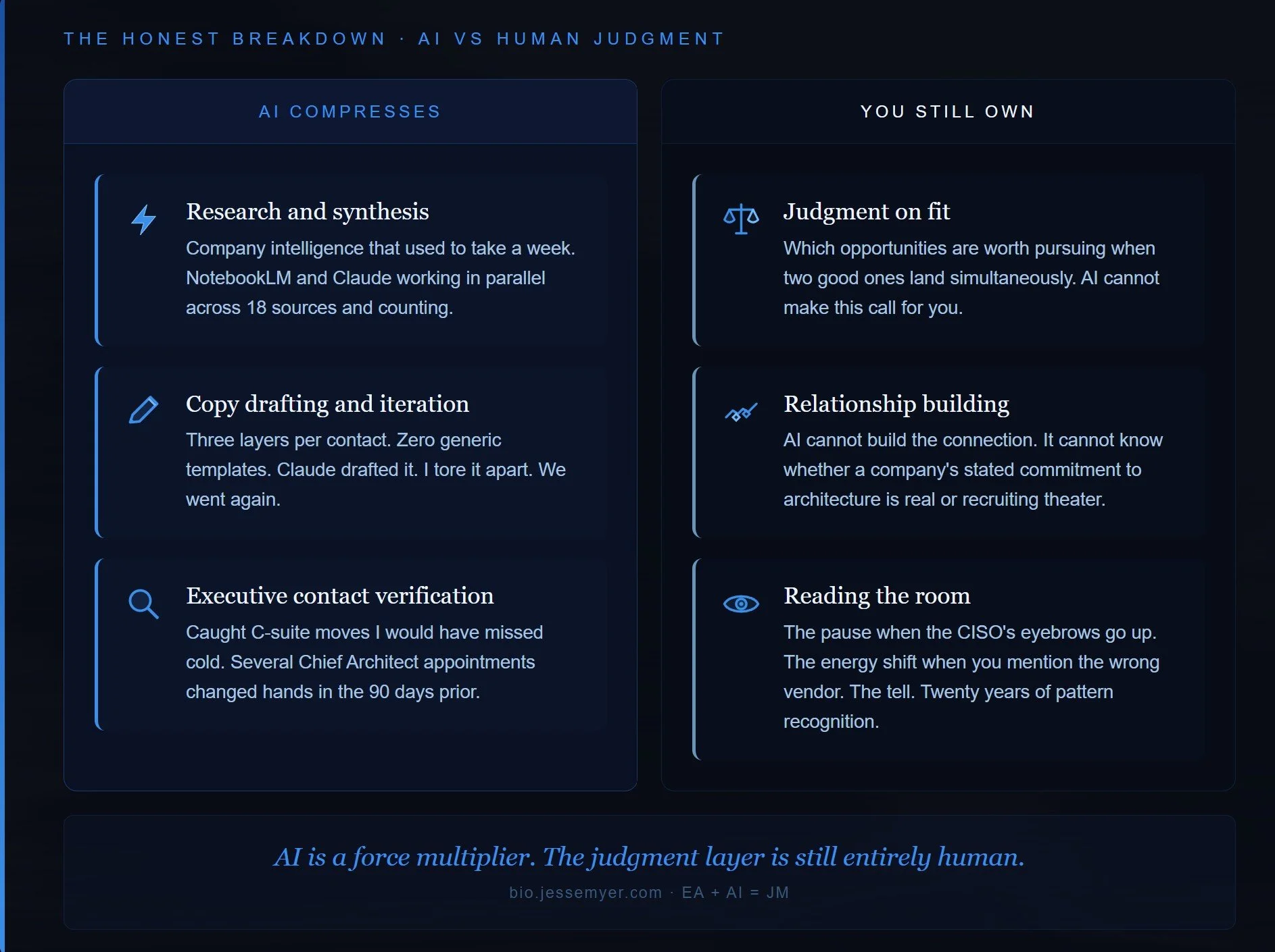 Those judgment calls are still entirely human. What AI does, across every tool in this stack, is compress the time between "I need to think through this" and "I have something worth acting on." For a search that is by nature strategic, senior, and relationship-driven, that compression is real and material.